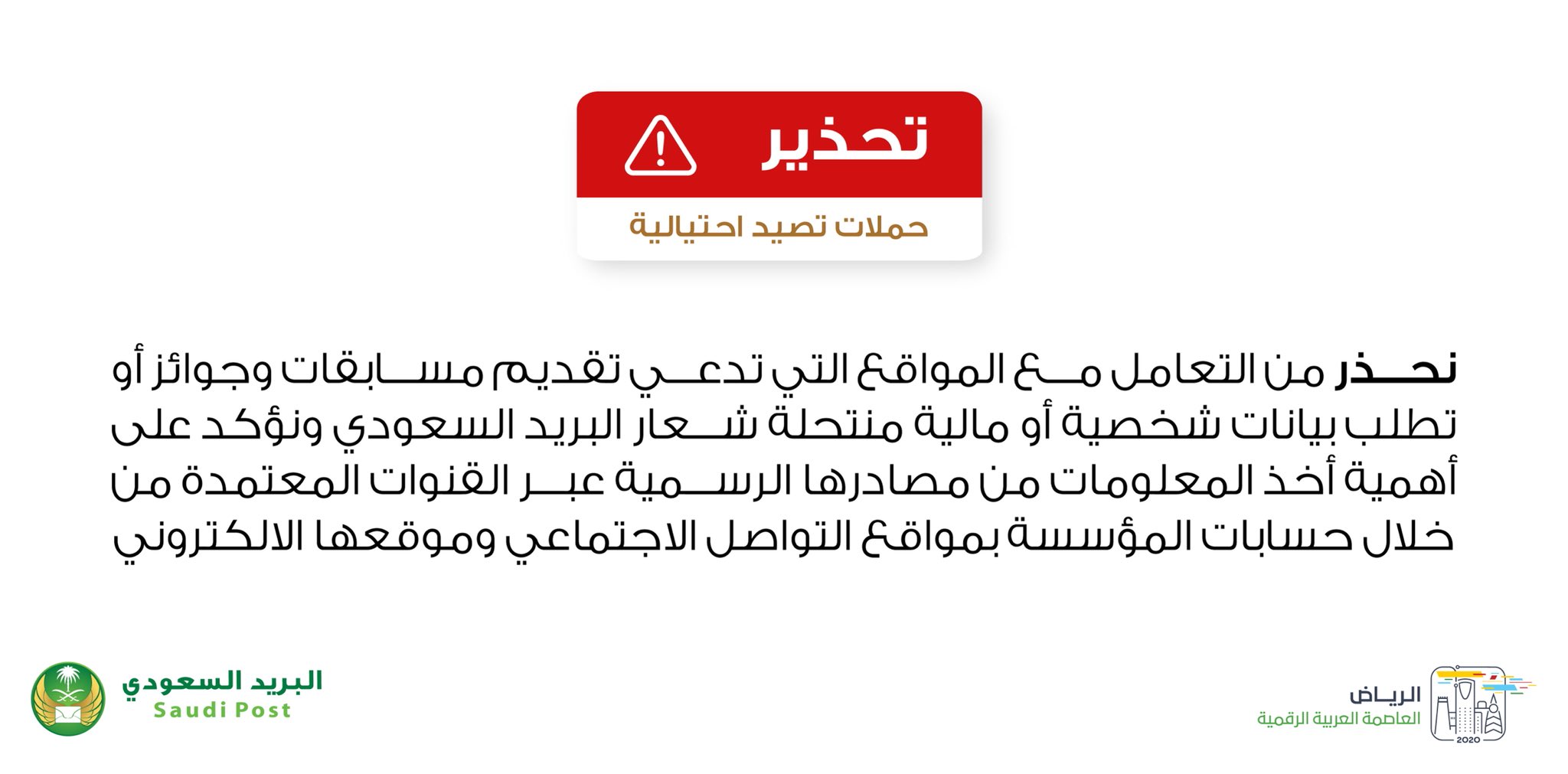 البريد السعودي On Twitter نحذر من التعامل مع المواقع التي تدعي تقديم مسابقات وجوائز أو تطلب بيانات شخصية أو مالية منتحلة شعار مؤسسة البريد السعودي ونؤكد على أهمية أخذ المعلومات من مصادرها