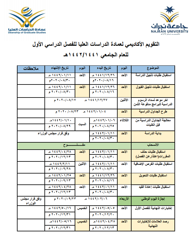 Deanship Of Postgraduate Studies تقويم عمادة الدراسات العليا