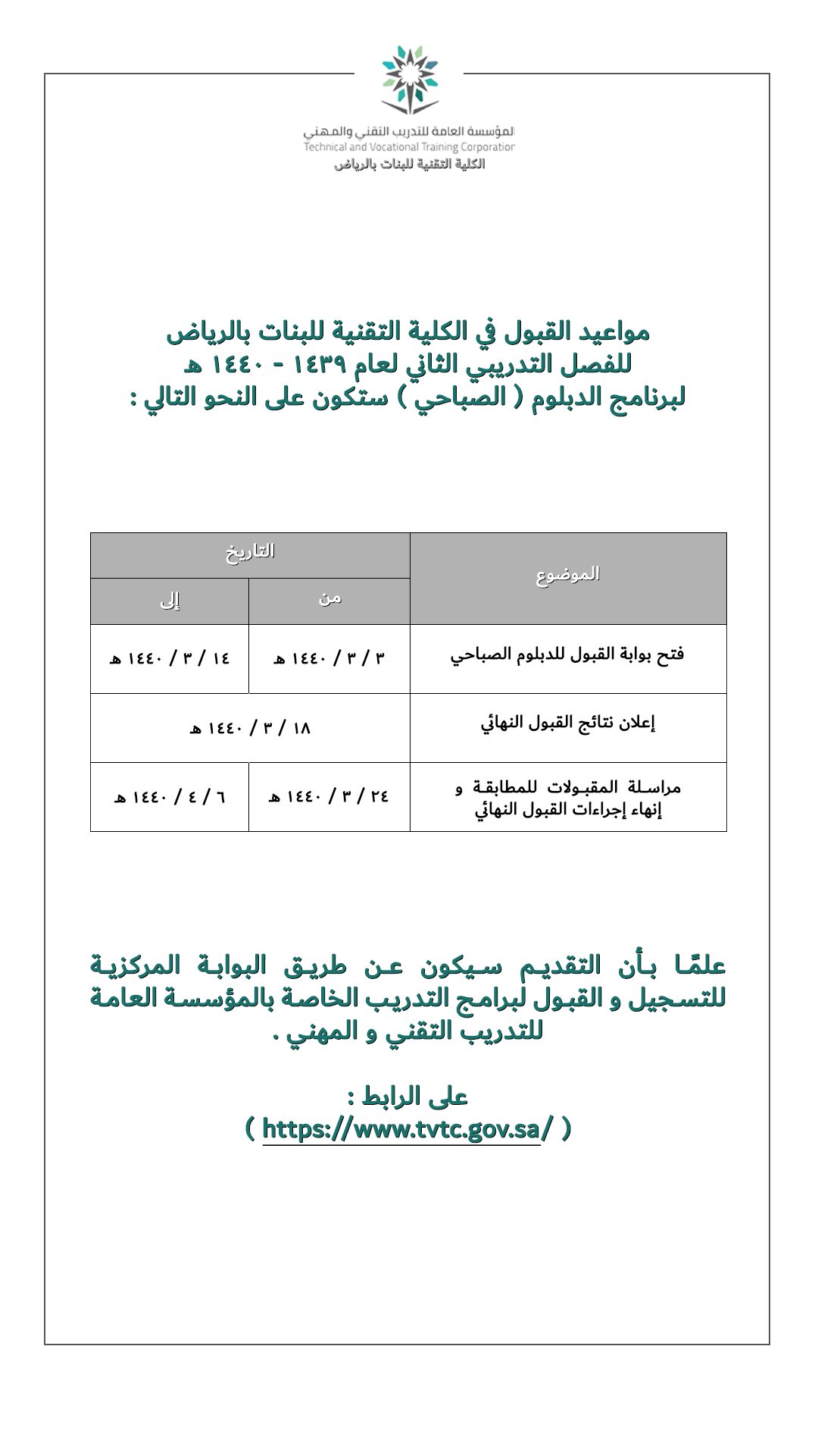 كلية التقنية للبنات بالرياض On Twitter تعلن الكلية التقنية للبنات بالرياض عن مواعيد التسجيل و القبول في الكلية للفصل التدريبي الثاني لعام 1439 1440 هـ لبرنامج الدبلوم الص باحي و التي ستكون بإذن