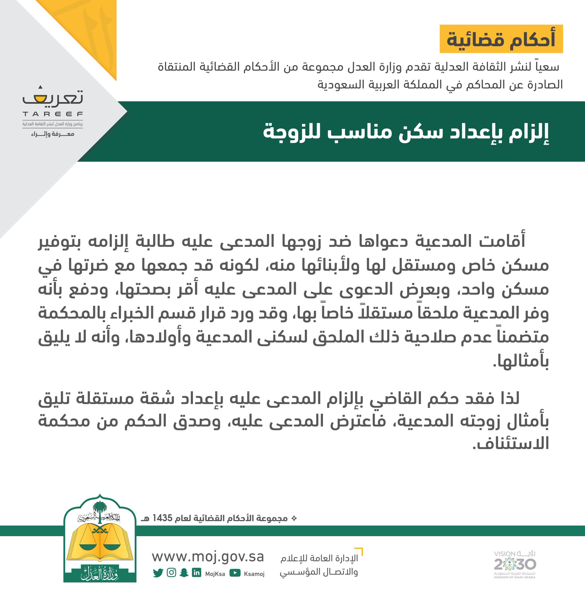 وزارة العدل On Twitter أحكام قضائية إلزام بإعداد سكن مناسب للزوجة